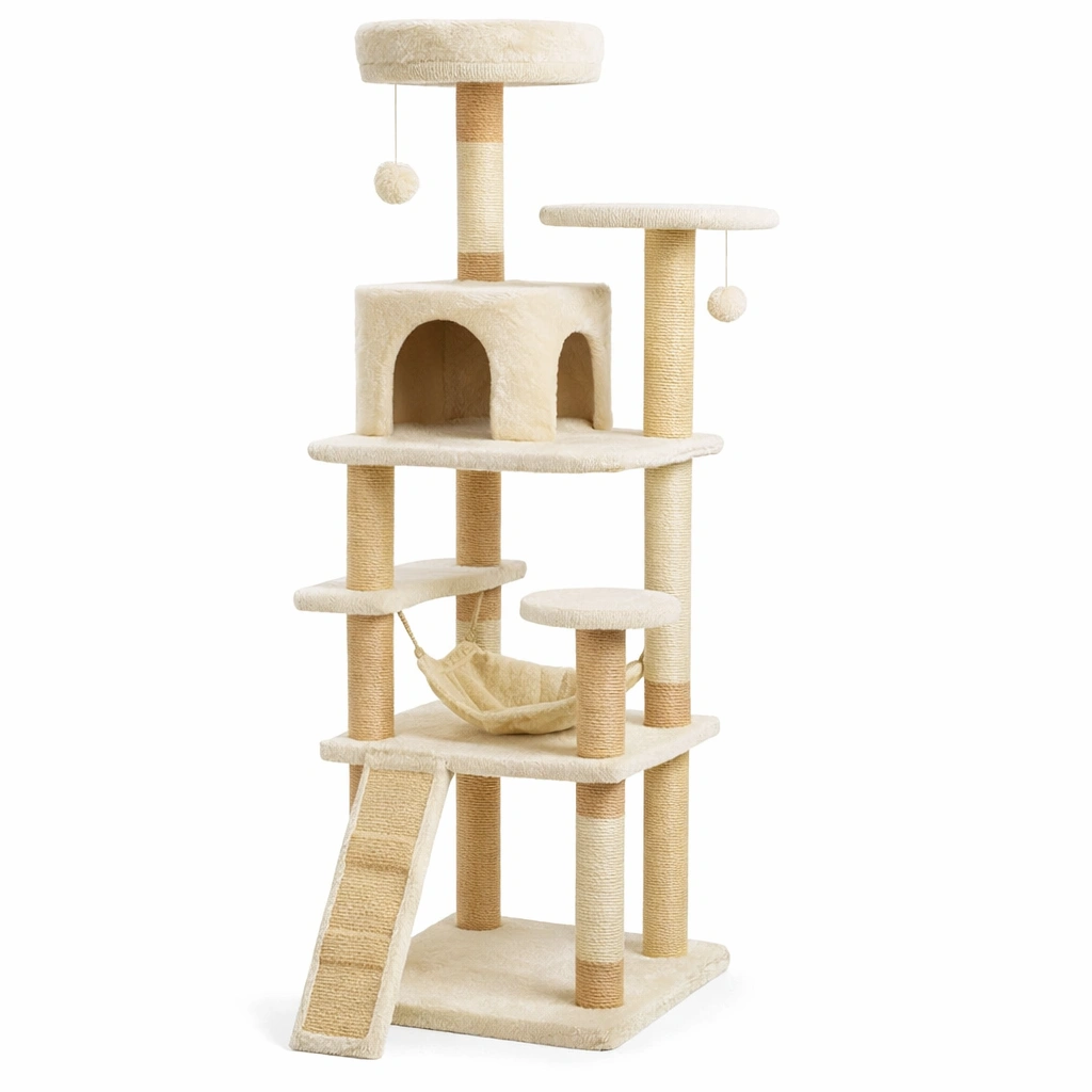 Incluye una hamaca y una cueva, así como pelotas colgantes para jugar. Los postes de sisal permiten el rascado natural.