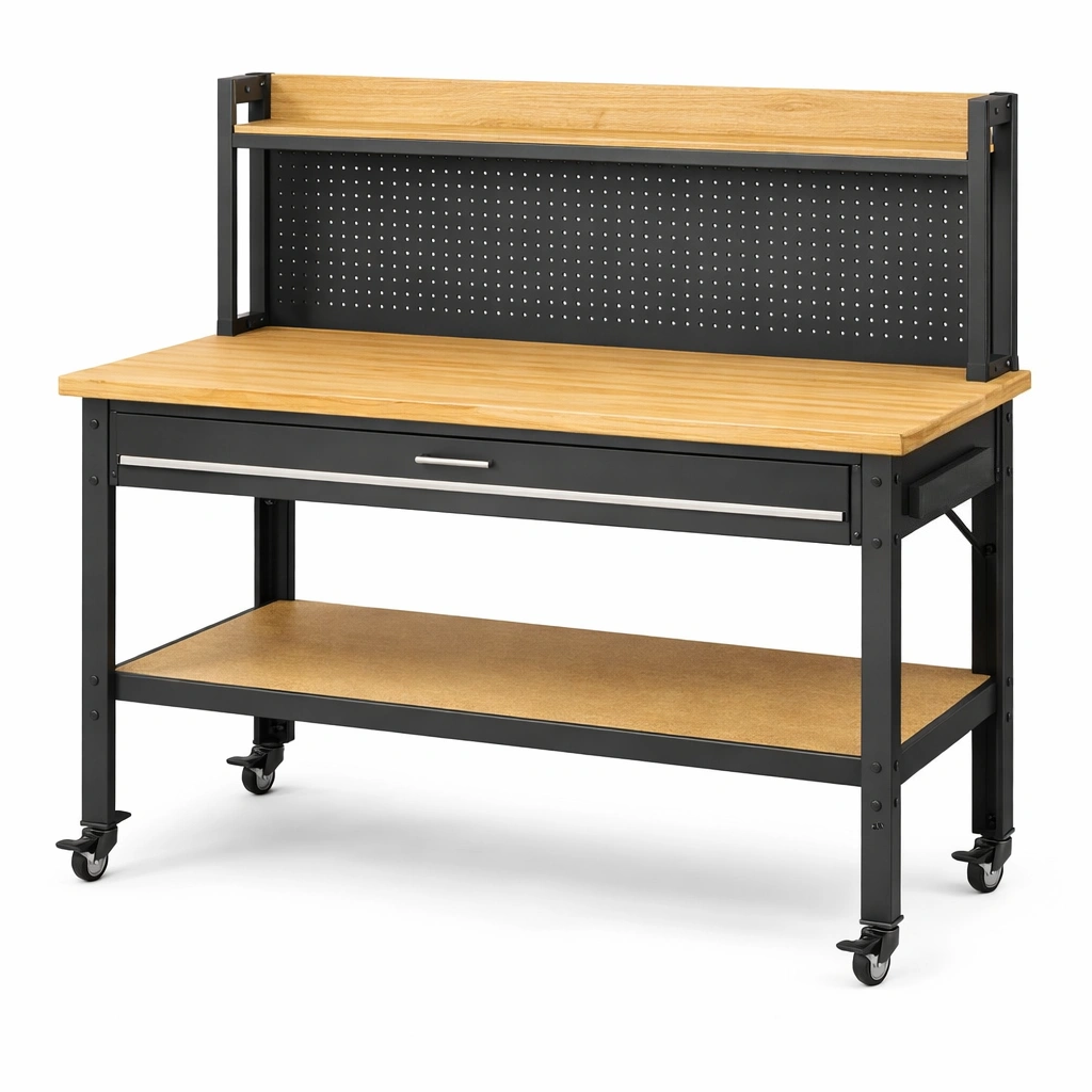 Mesa de trabajo con estructura de acero y superficie de MDF. Incluye un cajón amplio y estante inferior para almacenamiento. El estante superior y la superficie son de MDF.
